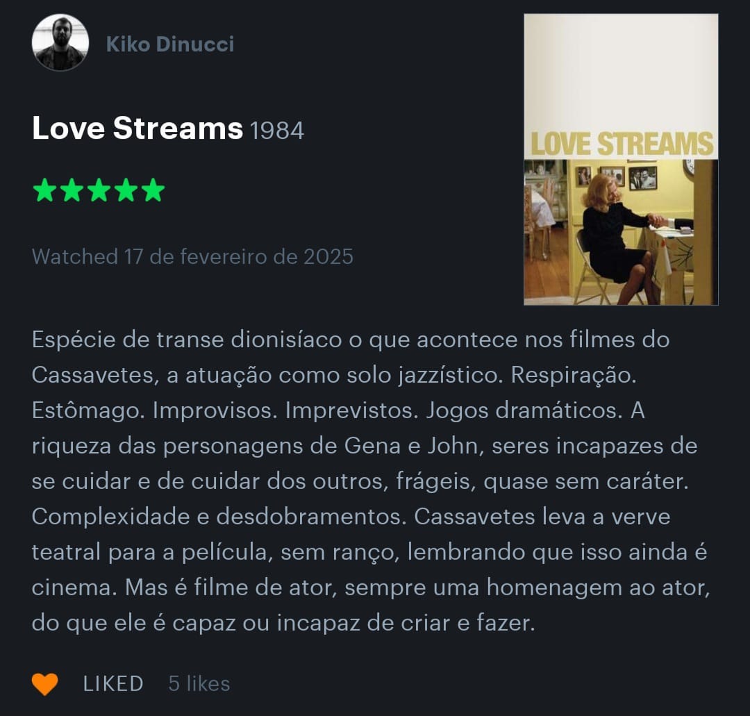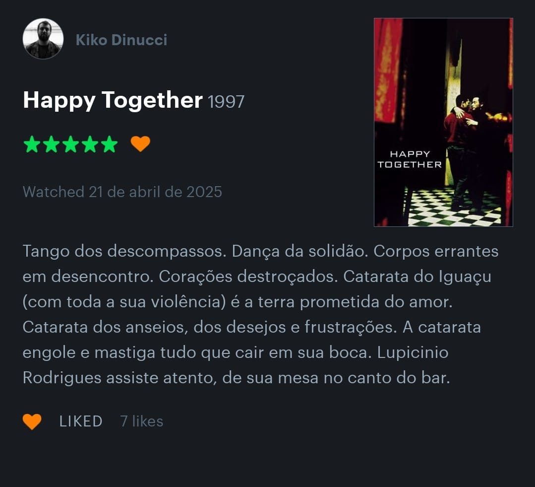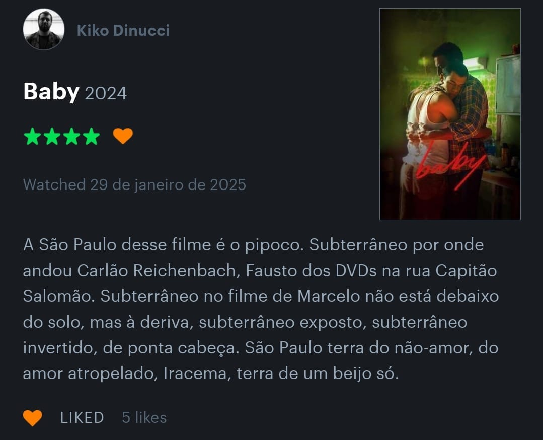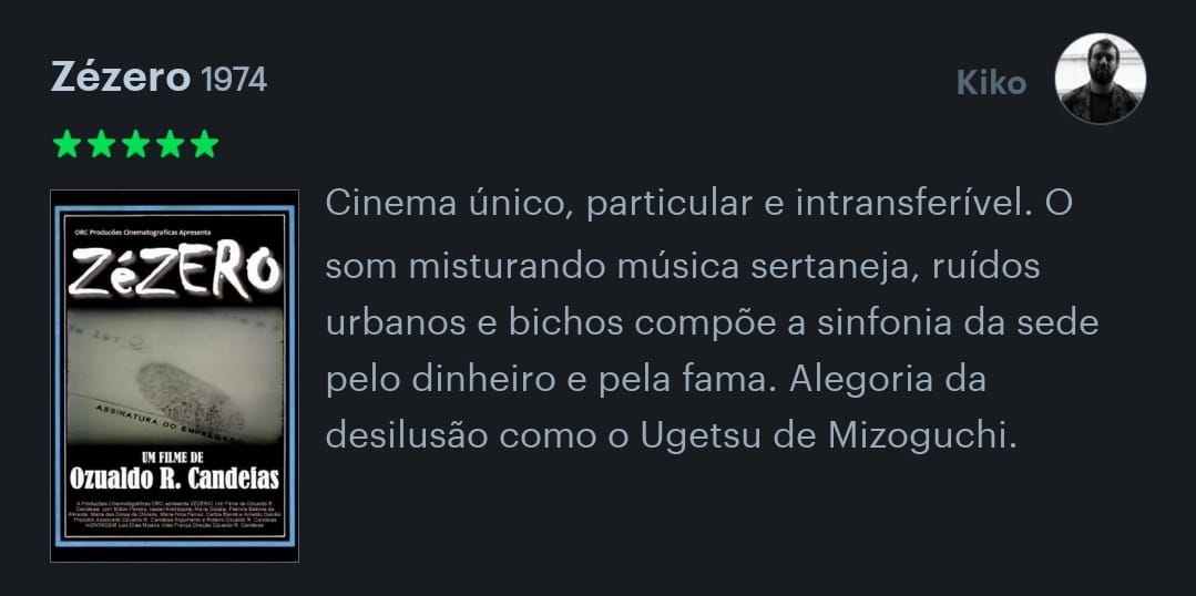 Recentemente, encontrei a conta do Kiko Dinucci por lá e fiquei encantada. A resenha do Kiko é poesia, é ritmo, lembra Rastilho (2020) e dá vontade de escutar Metá Metá. Com um dedilhar afiado e habilidoso, Kiko consegue dar vazão a um frenesi de referências em um texto curto e instigante. Além de músico, Kiko é cineasta e cinéfilo de carteirinha. Geralmente, quando eu topo com uma resenha dele por lá, acabo lendo mais, investigando o que ele tem assistido, quantas estrelas ele dá para os filmes que assiste e para quais filmes ele não dá notas. Selecionei aqui minhas resenhas favoritas dele e também quatro respostas do Kiko em entrevistas que ele deu à imprensa nos últimos anos. Para cada resposta em que o cinema vira protagonista, uma resenha de um filme.